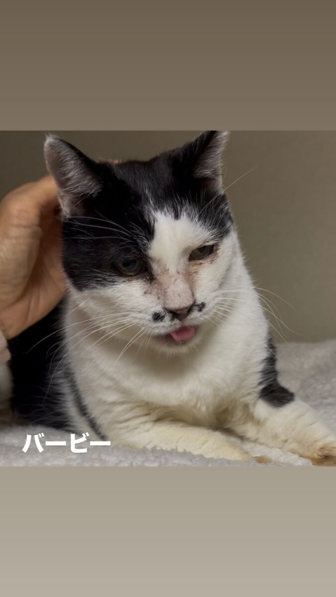 バービーちゃんも地域猫でした。体調を悪くしているお婆さんから餌やりが続けられないかもしれないと相談を受けて向かいましたが、バービーちゃんも酷い猫風邪で体調を崩している状態でしたので直ぐに保護しました。お婆さんはその2ヶ月後に亡くなってしまいました。