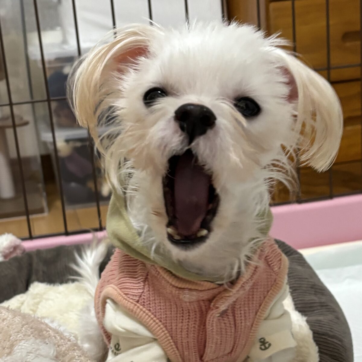 2.2キロほどの小さな体で、何度も子犬を産んだようで歯が少ないです。